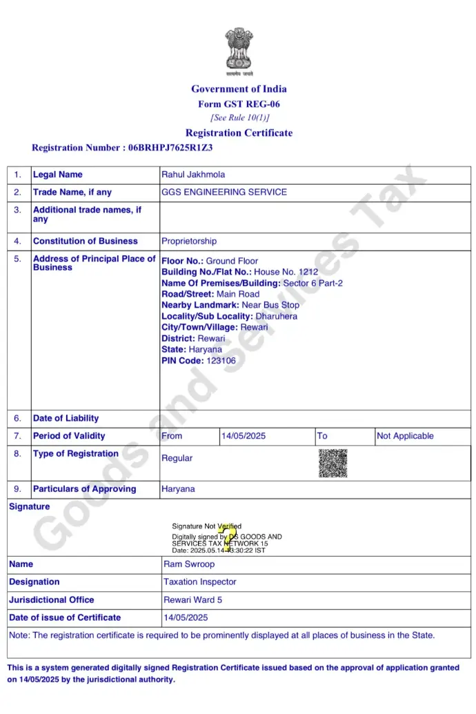 REG. NO. : 06BRHPJ7625R1Z3