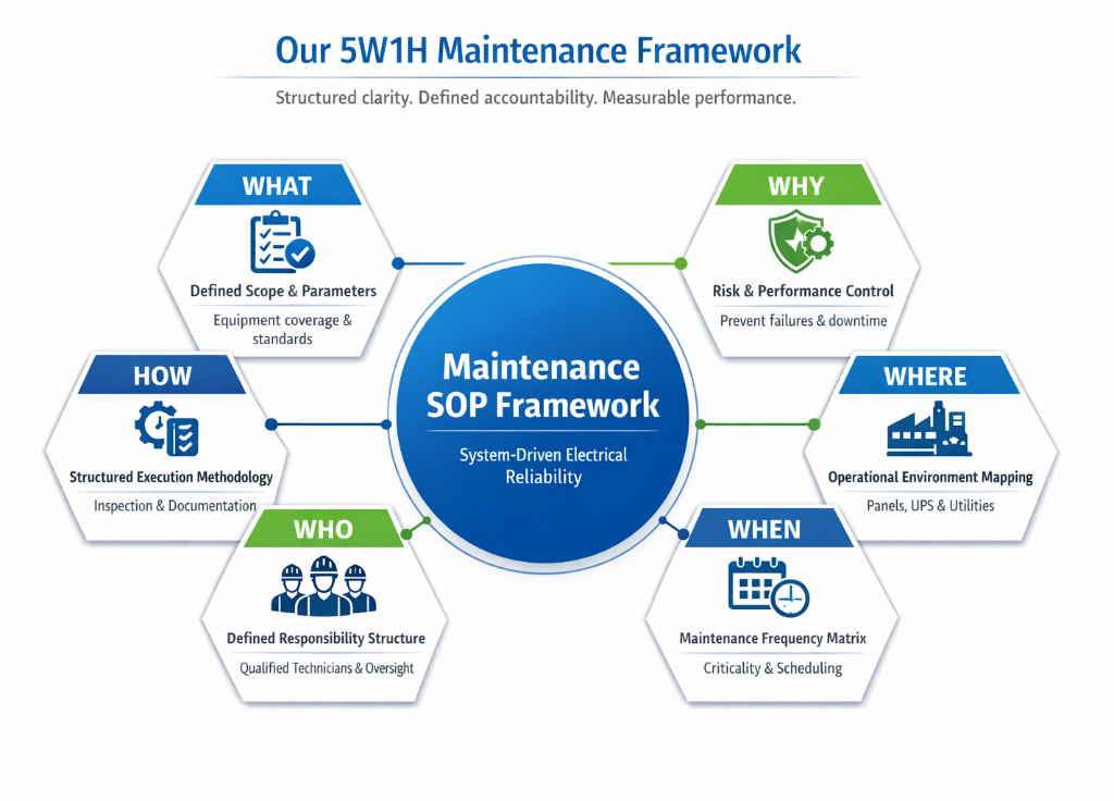 At GGS Engineering Service, Maintenance Standard Operating Procedures are developed using the 5W1H framework—defining what, why, where, when, who, and how of every maintenance activity. This structured methodology ensures that all operational tasks are clearly defined, technically validated, and consistently executed across electrical systems.